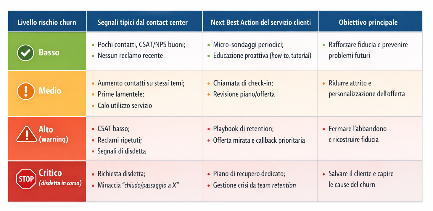 - Campagne di retention mirate sui segmenti ad alto rischio, con offerte, contenuti e azioni di caring pensate sulle cause specifiche di insoddisfazione emerse dal servizio clienti.
